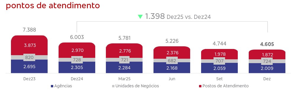 - Queda expressiva no fluxo às agências, compensada por autosserviço e canais digitais.