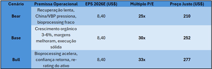 Em um cenário conservador, no qual a recuperação de bioprocessing decepciona e a China continua pressionando resultados, um múltiplo de 25x o EPS de 2026 seria plausível. Com EPS de US$ 8,40, isso leva a um preço justo na faixa de US$ 210 a US$ 220, representando um downside moderado.