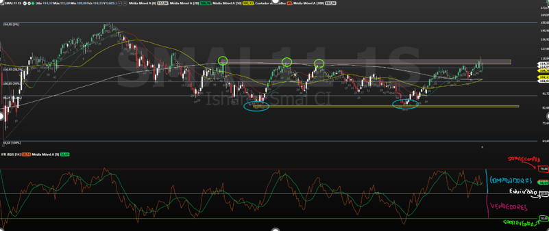 Acrescento a esse dados, uma linha no nível de 50 (região de equilíbrio de forças do mercado) e uma média móvel de 9 períodos.