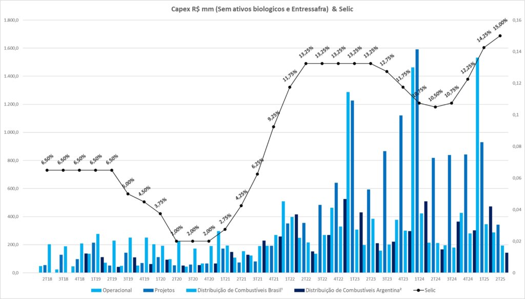 Abaixo dois gráficos da Raizen. Notem que houve aumento de investimento com a estabilidade da SELIC em 2022 e durante queda em 2024, que acabou por elevar demais a divida e ficar quase que insustentável com a rápida elevação do juros em meados de 2024.