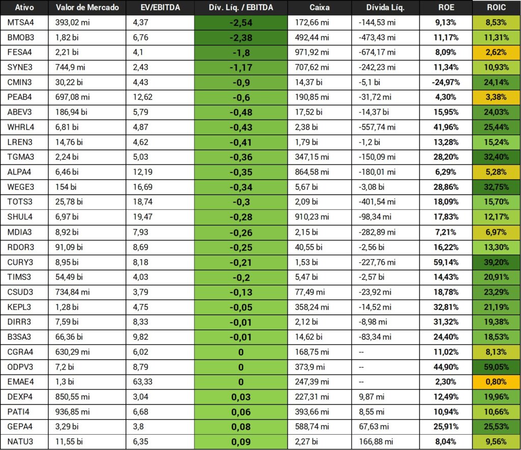 Na tabela abaixo, algumas das empresas com divida liquida / EBITDA negativa ou muito próxima de zero. Boas geradoras de caixa, com investimentos saudáveis e ROIC elevados.