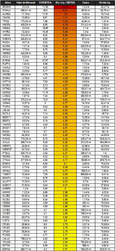 Na tabela abaixo, empresas com divida liquida / EBITDA acima de 2,5. Normalmente, empresas com este indicador acima de 3 ou 3,5 ultrapassa o limite estabelecido em contratos de dívida (covenants).