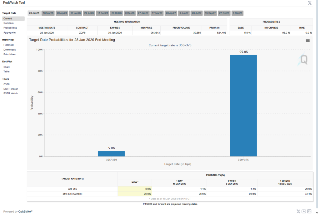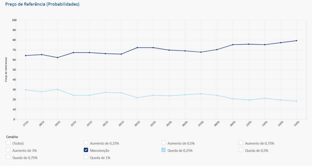 Na imagem vocês podem observar que o mercado aposta na manutenção dos juros para a reunião no final de Janeiro.