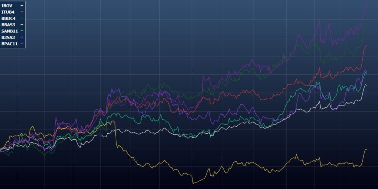 A imagem abaixo mostra o IBOV e alguns dos principais bancos negociados na B3 no mesmo período.