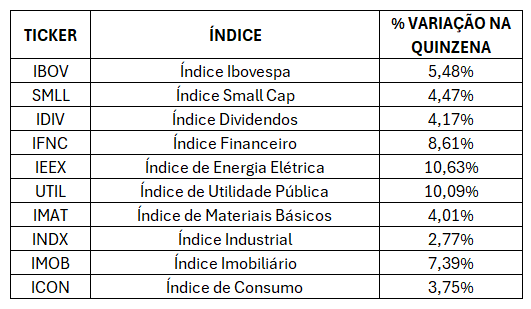 Os índices setoriais (como financeiro, consumo, energia, indústria, materiais básicos e imobiliário) mostram como cada setor específico se comportou no período.