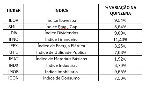 A tabela abaixo mostra a variação percentual de cada índice, servindo como referência comparativa do desempenho ao longo do período: