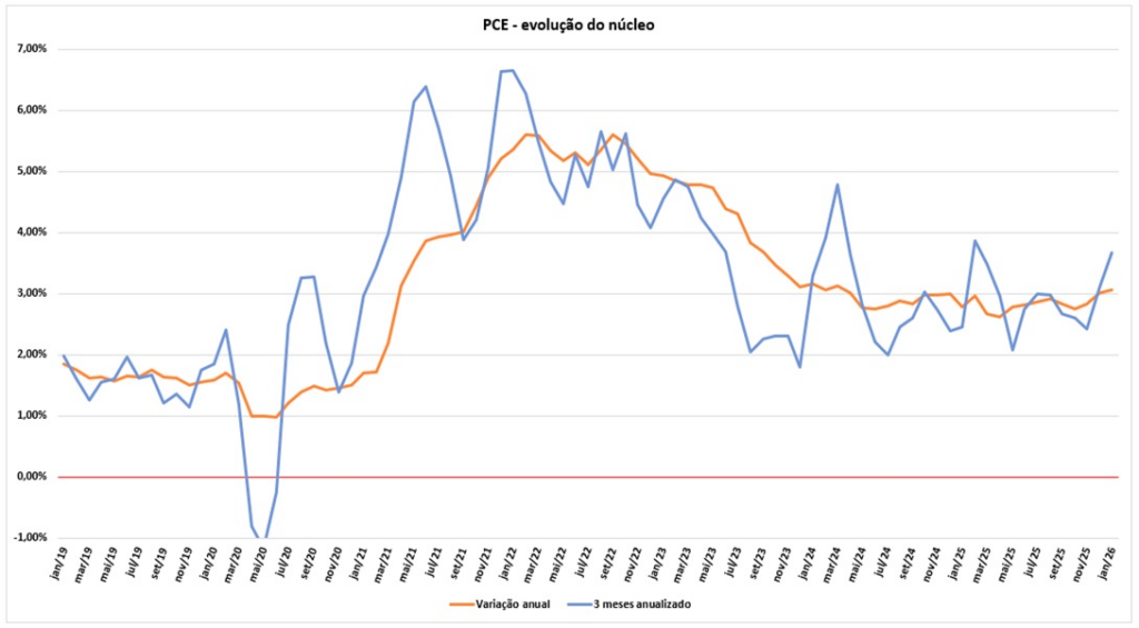 A inflação oficial de janeiro veio ligeiramente abaixo do previsto. O gráfico mostra que a inflação anual está acima de 3%, bem acima da meta do Fed e também acima do CPI. A inflação anualizada de 3 meses está ainda mais forte, próxima de 4%, possivelmente refletindo o pico sazonal do início do ano.
