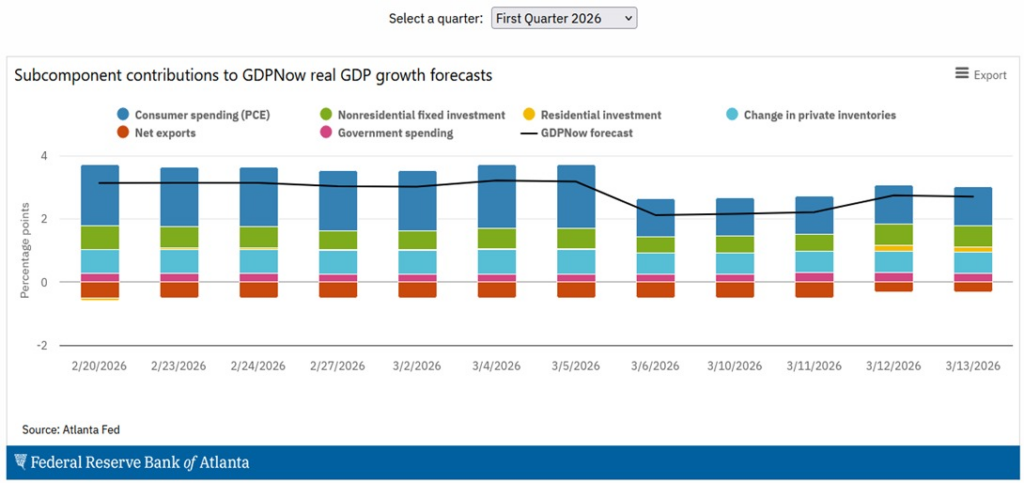 O gráfico seguinte mostra a projeção do PIB deste trimestre pelo Fed de Atlanta, que apresentou leve melhora, com a demanda privada doméstica crescendo cerca de 2,5%.