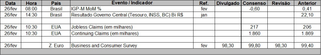 Além disso, o mercado acompanha as negociações entre EUA e Irã em Genebra. Trump estabeleceu prazo até 6 de março para um acordo e ameaçou com ataques militares caso o prazo não seja cumprido.