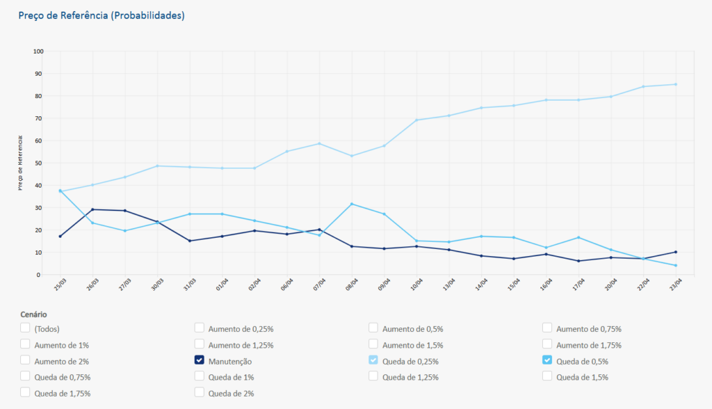 Nesse momento o mercado precifica um corte de 0,25 para a reunião que acontece nesta quarta-feira.