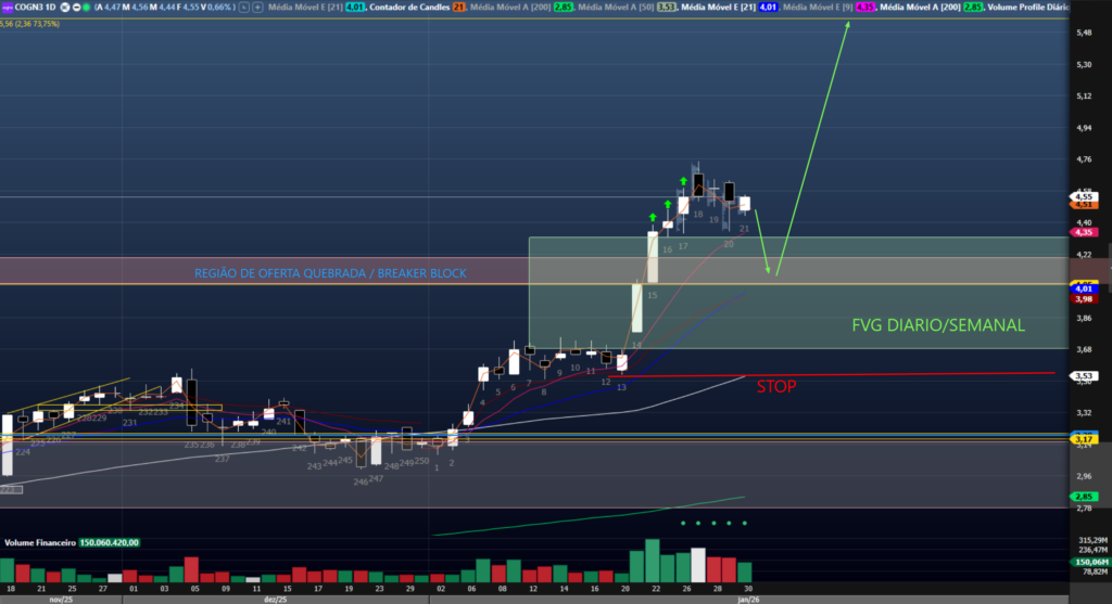 COGN3 foi outra escolha difícil, pois já estou posicionado desde os R$3,00 e já subiu mais de 350% em praticamente um ano. Porém o ativo confirmou quebra de região de oferta tanto no diário como no semanal, com bastante urgência, deixando FVGs, Breaker Block, mmE21 como possíveis suportes. O stop é caro, mas os alvos são alongados. Entradas abaixo do R$4,20 podem permitir bom gerenciamento. Ativo com liquidez por opções, inclusive em strikes mais alongados.