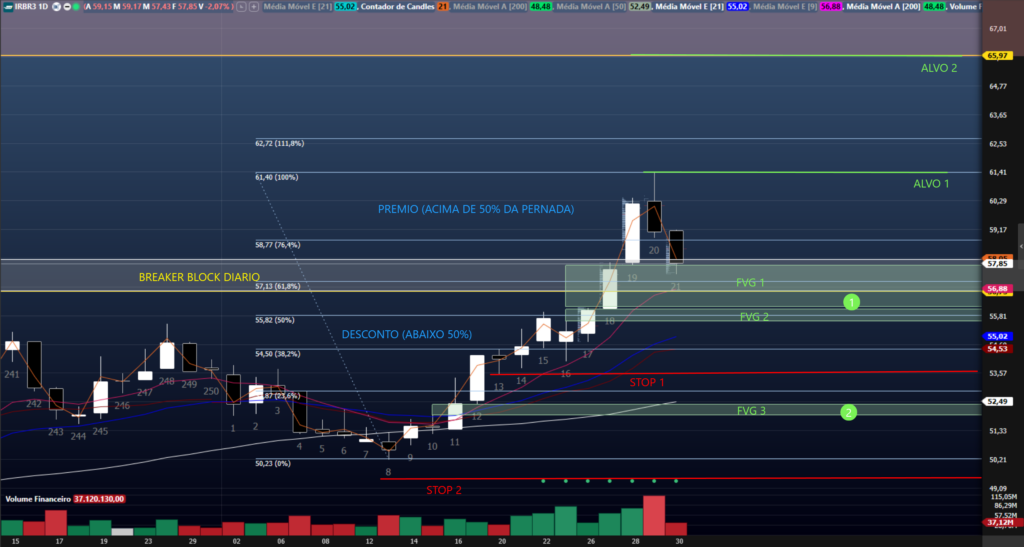 A escolha por IRBR3, apesar de todo o apelo fundamentalista a favor da ação, não foi das mais fáceis devido ao fechamento do candle semanal, que não conseguiu fechar acima da ultima região de oferta. Esse retorno pode indicar uma continuidade na lateralidade por mais tempo (MRVE3 manda lembranças!), exigindo um maior apuro nas compras e um bom gerenciamento da posição. No diário, tivemos uma boa confirmação de rompimento da região de oferta no dia 28/01, porém os 2 candles seguintes demonstraram muita fraqueza na continuidade já retornando para o Breaker Block formado. Os mais agressivos podem alinhar entradas na região 1, preferencialmente no FVG 2 alinhado com região de desconto, mmE21 e retração de Fibo. Os mais precavidos podem esperar o teste na região 2 (FVG 3), em busca de um stop mais barato e um payoff maior. Sizing é a palavra chave dessa operação e por ser um ativo bem liquido possibilita um bom gerenciamento.