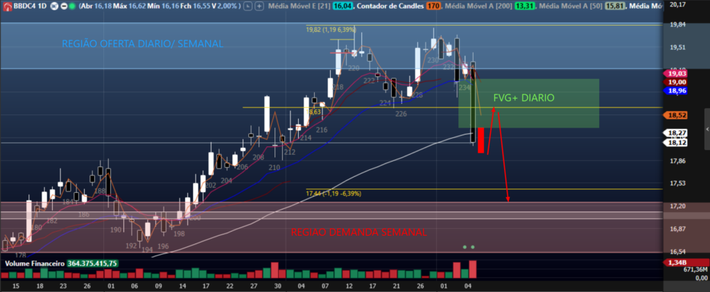 BBDC4 fechou a sexta-feira ativando setup baixistas, confirmando uma figura de reversão em topo, ancorado em região de oferta no diário/semanal. Caso confirme mais um fechamento baixista, preferencialmente perdendo a mm50, pode deixar ineficiências (FVG+), região ideal para tentar vendas com alvo inicial na região de demanda no semanal 17,19-16,59. Atentar para um payoff favorável, evitar entradas abaixo do 18,63.