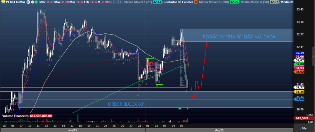 Petr4 está em busca de testar a região de demanda do 60’ na região do 31,26-30,85. Se esse teste for rápido, seguido de uma boa inflexão, pode dar chances de compra no 60’ e buscar inicialmente a região de oferta do 60’ que ainda não foi validada, mas vai servir como resistência no 32,58-32,91. Temos um Payoff em torno de 3,00 para a possível operação.