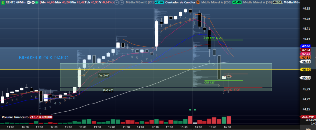 O ativo Rent3, desde o teste das regiões de demanda no semanal (início de 2025) segue em uma tendência de alta tanto no diário como no semanal. No diário, está testando a mme9 após romper e confirmar acima da região de oferta, agora um breaker block. O forte movimento de sexta jogou o preço nas várias ineficiências que foram deixadas pelo movimento altista. No 60’, já temos setup ativo de compra (CRT 120’/60’) com stop ideal abaixo da região de demanda do 60’ (45,00). Fico atento caso ocorra novamente rompimento do 46,15 buscando como alvo o 48,06, um payoff em torno de 1,7.