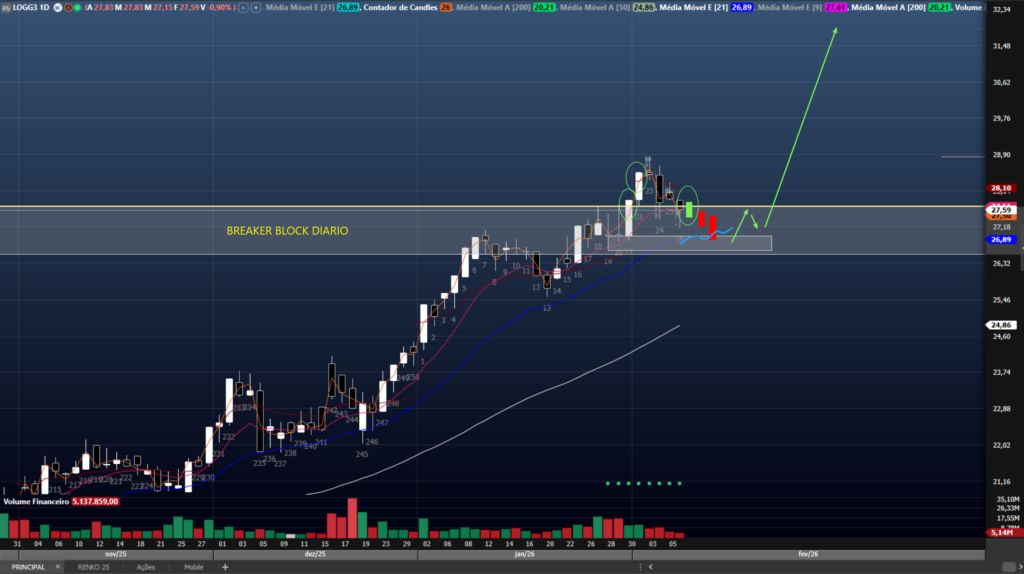 LOGG3 trabalha o preço no TH e já rompeu a ultima região de oferta do diário. As correções iniciadas na semana passada tem que demonstrar fraqueza, de preferência com mais um fechamento no diário acima do R$27,70. Dessa forma, a mmE21 é uma boa região para entrada com stop técnico abaixo da região do R$26,00. Rompendo o topo, ativo entra em um vazio gráfico, sendo ideal dimensionar saídas com projeções de Fibo.