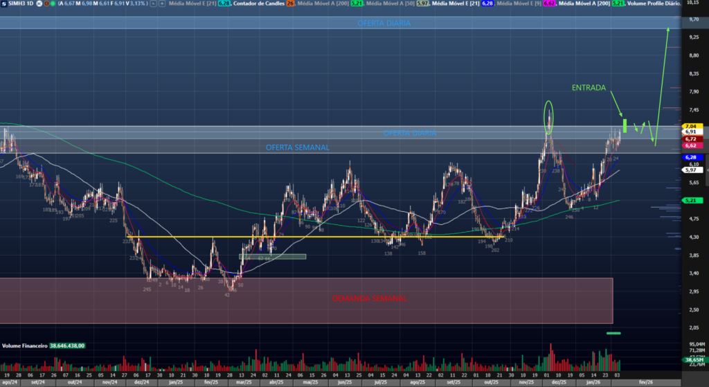 SIMH3 trabalha o preço em uma região de oferta do diário e caso confirme mais um bom fechamento acima do R$7,05 podemos usar a região como Breaker Block e gerenciar compras. Atentar para a mm200 do semanal. Alvo inicial na região do R$8,00, mas buscaria um payoff melhor até a região do R$9,45. Gerenciamento da posição depende do tipo de entrada e condução de cada um, mas as mmE21 e a mmA50 do diário são bons parâmetros para condução.